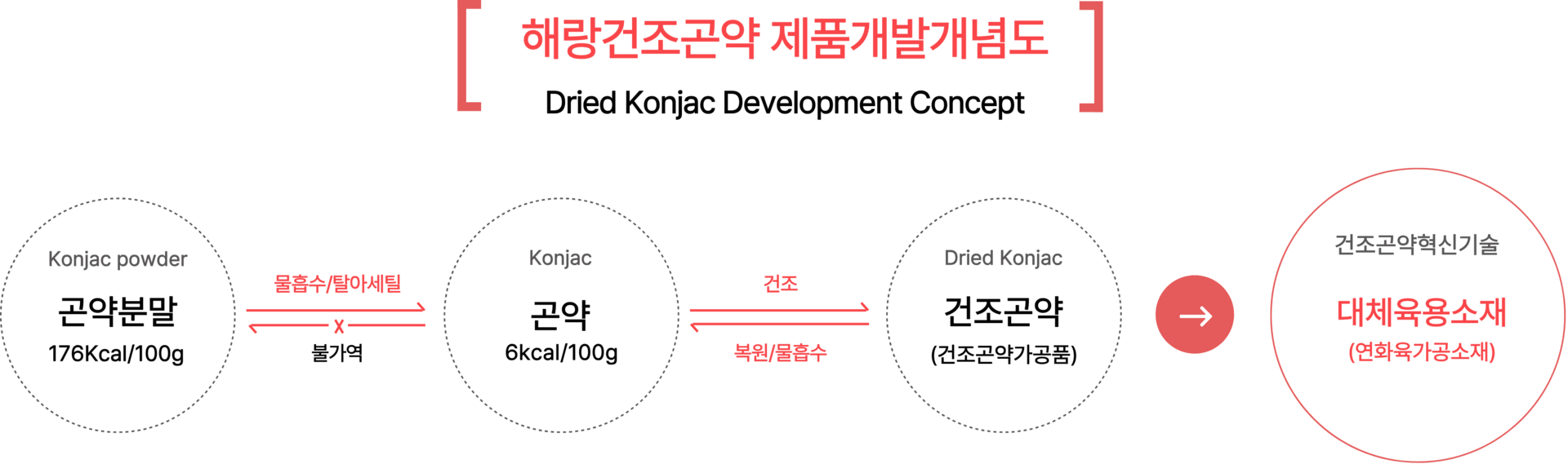 - 건조곤약 혁신기술 적용 제품 : 대체육용곤약소재, 대체어란용곤약소재